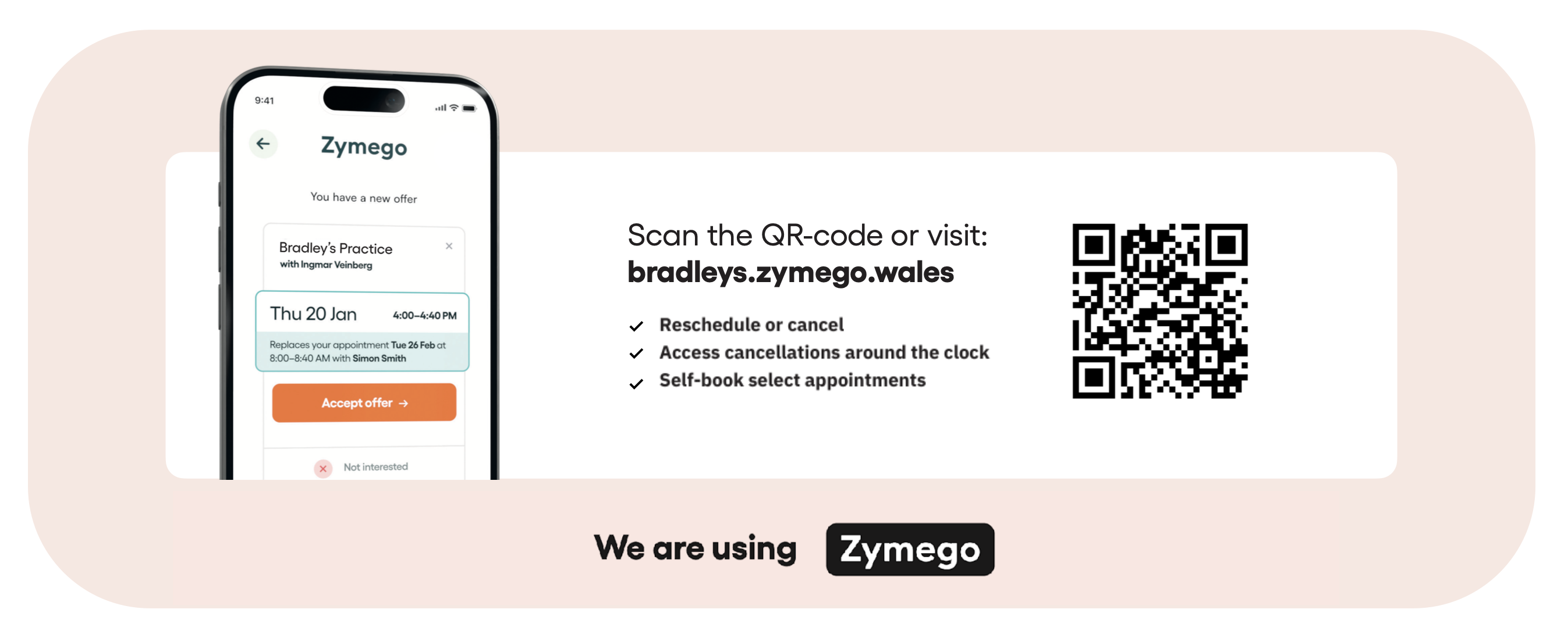 You can self-book select appointments digitally via Zymego using SMS verification.